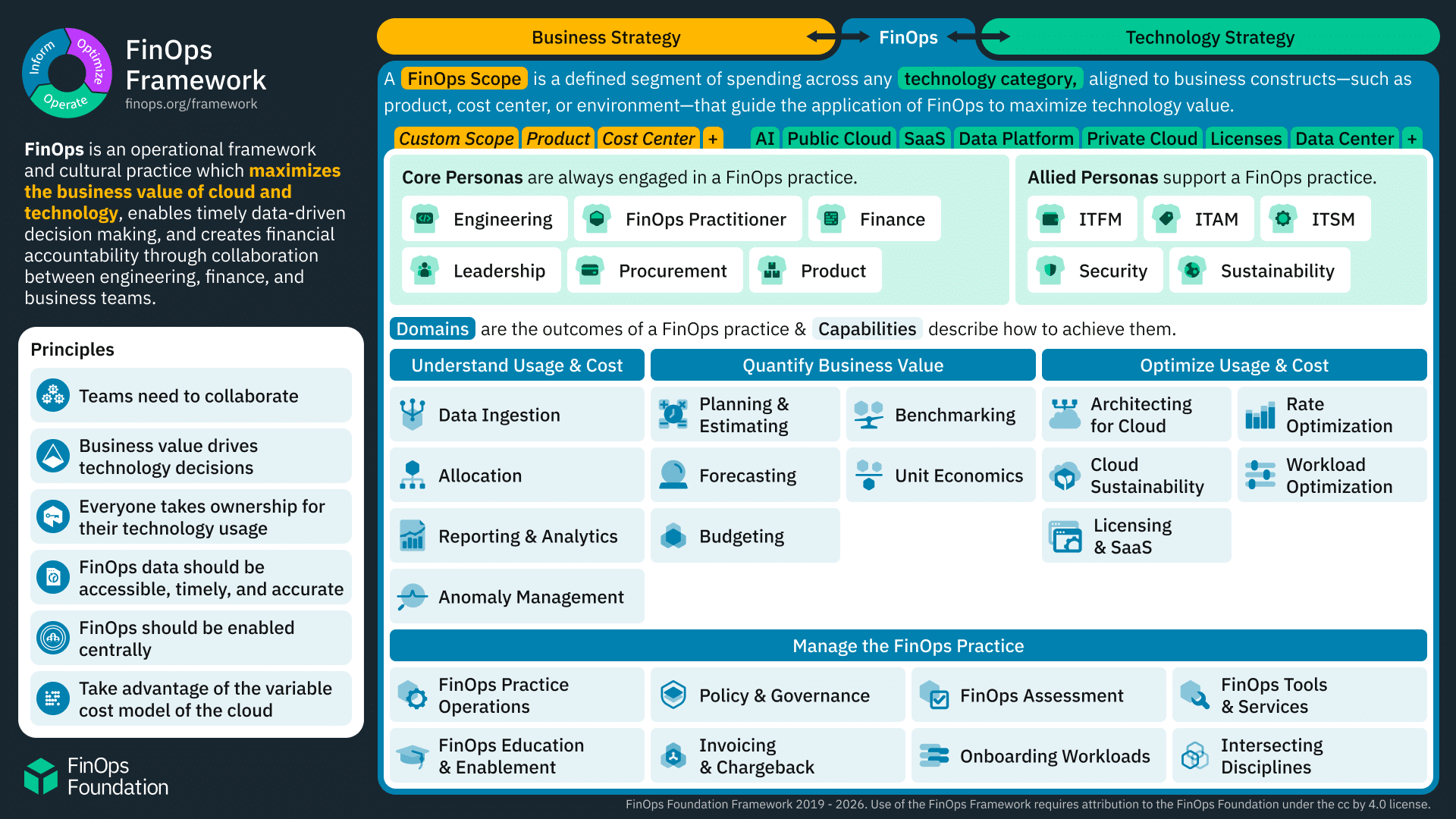 FinOps Scopes defined for public cloud focus on managing and optimizing cloud-based consumption in support of business outcomes such as cost efficiency, scalability, and delivery velocity. FinOps Capabilities are applied to cloud usage to enable informed decisions, shared accountability, and continuous alignment between cloud investment and business value.