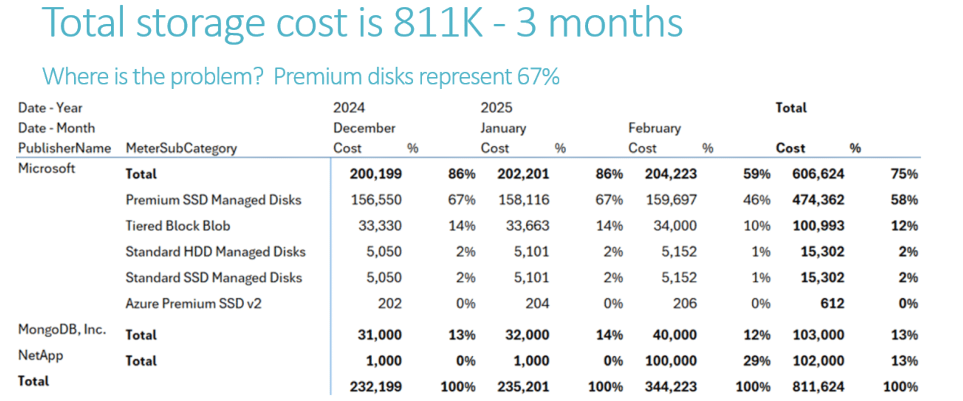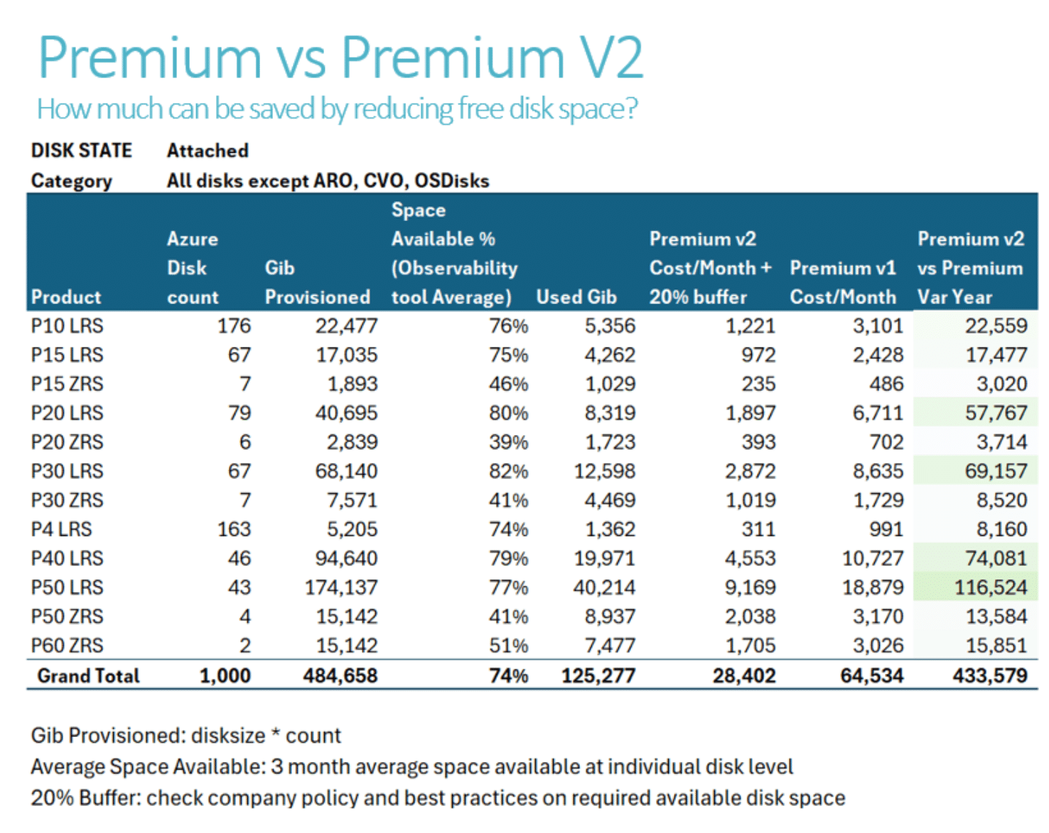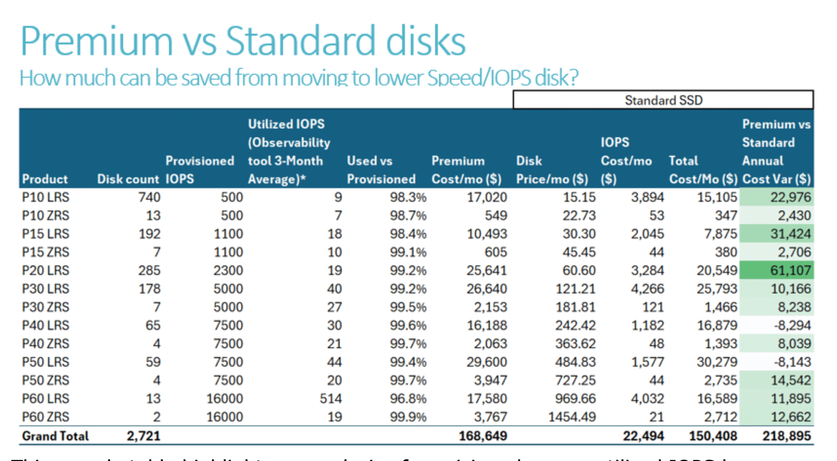 The sample table below builds on the earlier analysis of provisioned versus utilized IOPS by illustrating the potential savings from moving to a Standard Disk of the same size. It also accounts for key nuances — such as the IOPS billing model. While Premium Disks include provisioned IOPS at no additional cost, Standard Disks charge based on actual IOPS usage, making the previous three months of usage a critical input for accurate cost modeling.