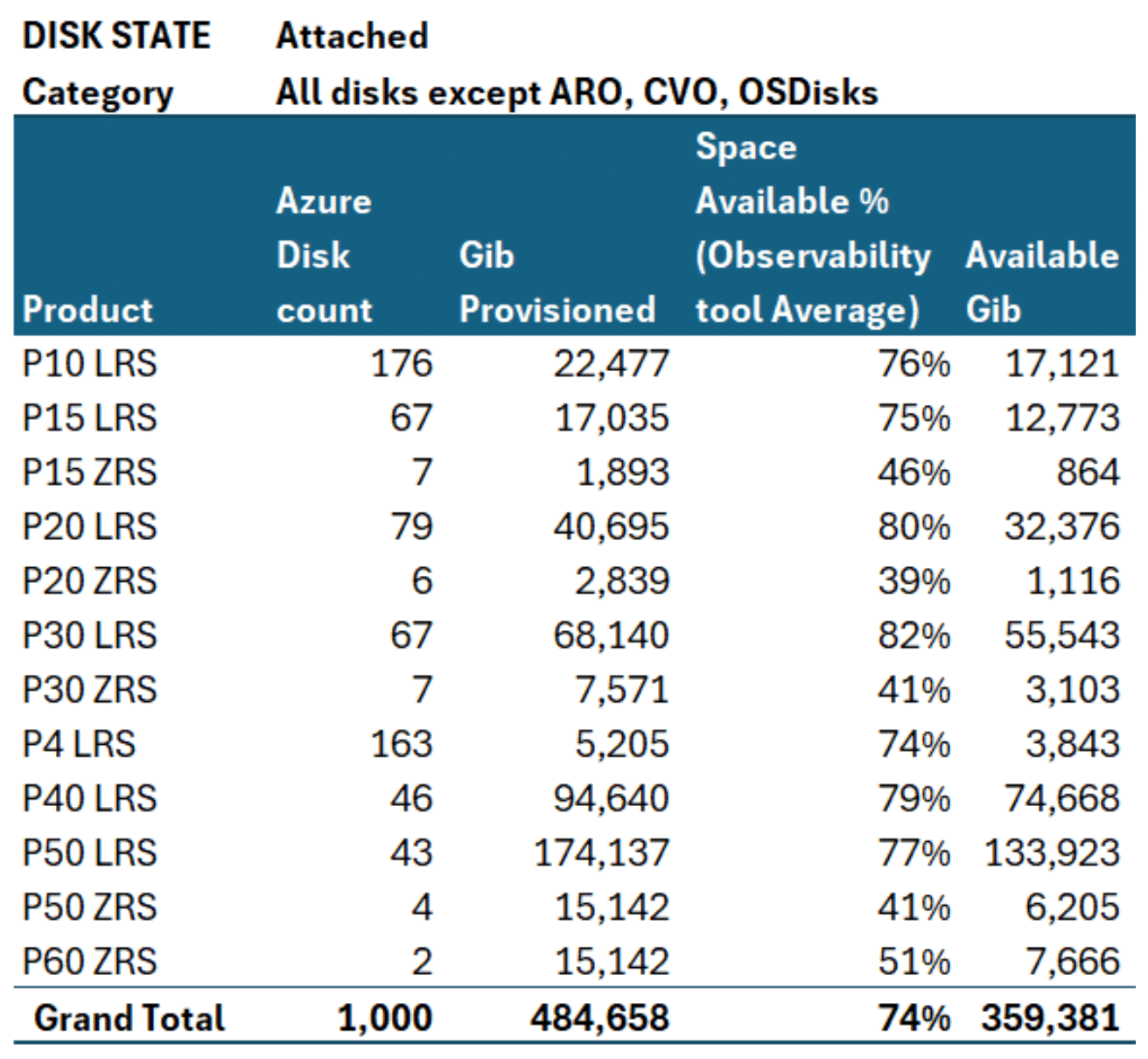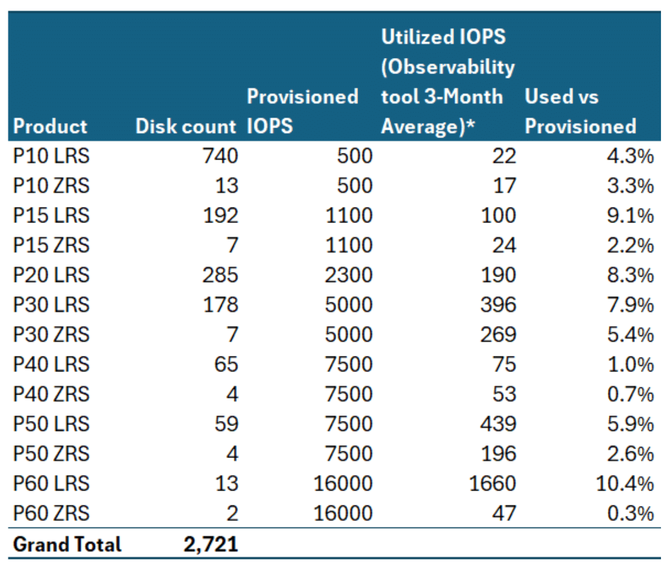 The results shown in the sample table below provide an indication of where to focus analysis and optimization efforts using the aggregated average value as a rough heuristic. The analysis aggregates the results for each product into a single “utilized IOPS” value (e.g. an average for all P10 LRS Disks). This simplification means that the results may not be accurate, on a per-Disk basis, but they offer a general measure for optimization potential. Returning to the P10 LRS Disks, the large number of Disks and low average utilization vs. provisioned IOPS indicate optimization potential.