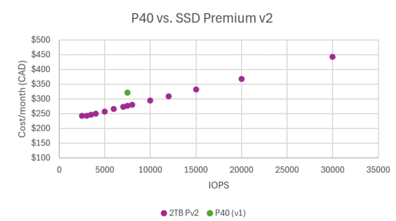 This sample chart compares a range of Premium V2 Disks (with 2TB of storage and fixed throughput) with an equivalent Premium P40 Disk.